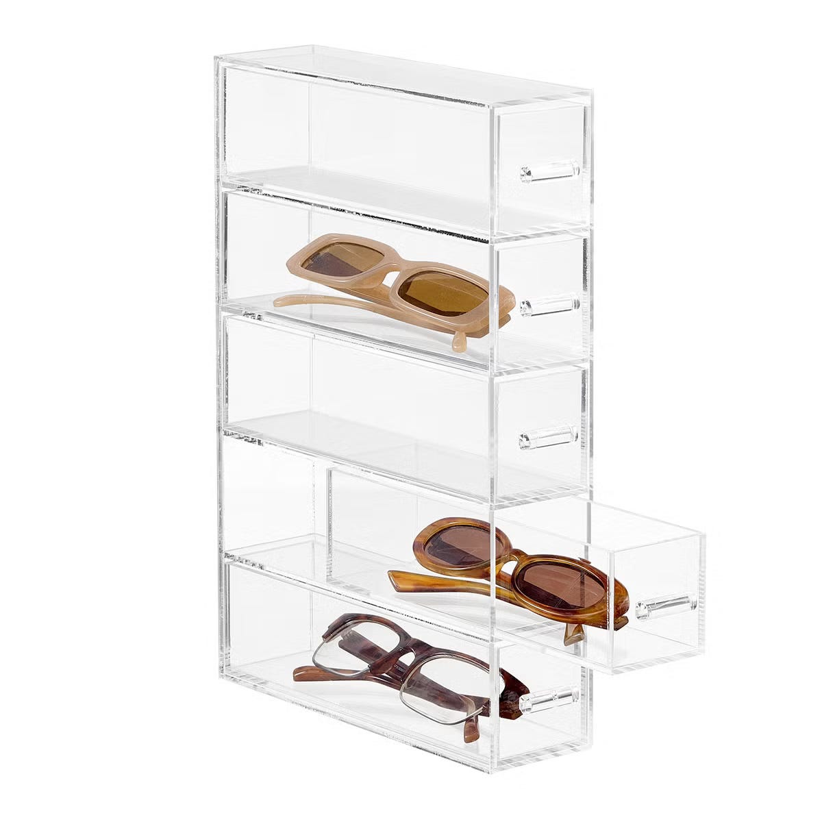 For your eyewear, an acrylic organizer, because you want them tidy and protected but still visible.